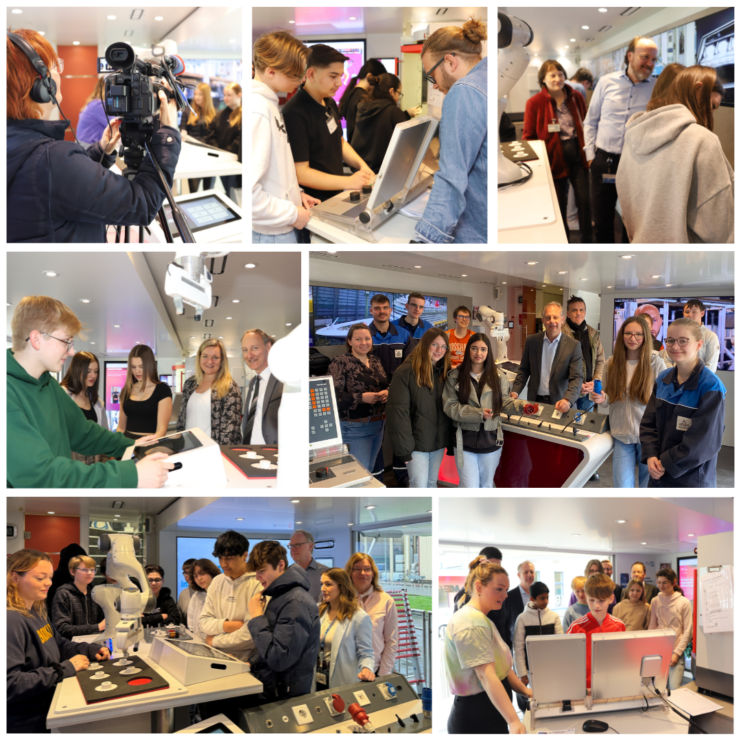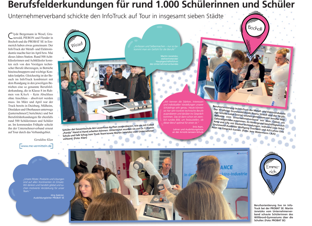Um Schülerinnen und Schüler auf diese Möglichkeiten hinzuweisen, schickte der Unternehmerverband den InfoTruck der Metall- und Elektroindustrie 2024 wieder auf Tour durch sein Verbandsgebiet. Insgesamt fuhr das Hightech-Gefährt auf die Werkshöfe von zehn Unternehmen in sieben Städten. Rund 700 Schülerinnen und Schüler konnten so wortwörtlich „einsteigen“ in die Zukunftsindustrie: Im InfoTruck packten die Jugendlichen tüchtig mit an: Sie steuerten Maschinen und fertigten Musterteile; erhielten von Unternehmensvertretern und Auszubildenden Informationen aus erster Hand und durften in den Betrieben einen Blick hinter die Kulissen werfen, um Arbeitsabläufe live kennenzulernen. Die Schülerinnen und Schüler erfuhren auch, dass sie sich jetzt mit wenigen Klicks direkt bewerben können. Das neue Internet-Portal der deutschen Metall-Arbeitgeberverbände, www.zukunftsindustrie.de, macht es möglich. Und es richtet sich nicht nur an Jugendliche. Lehrerinnen und Lehrer profitieren von den Unterrichtsideen und praxiserprobten Materialien, Firmen können sich als attraktive Ausbildungsbetriebe präsentieren, und Eltern erhalten Tipps rund um die Berufswahl und den Bewerbungsprozess ihrer Kinder.