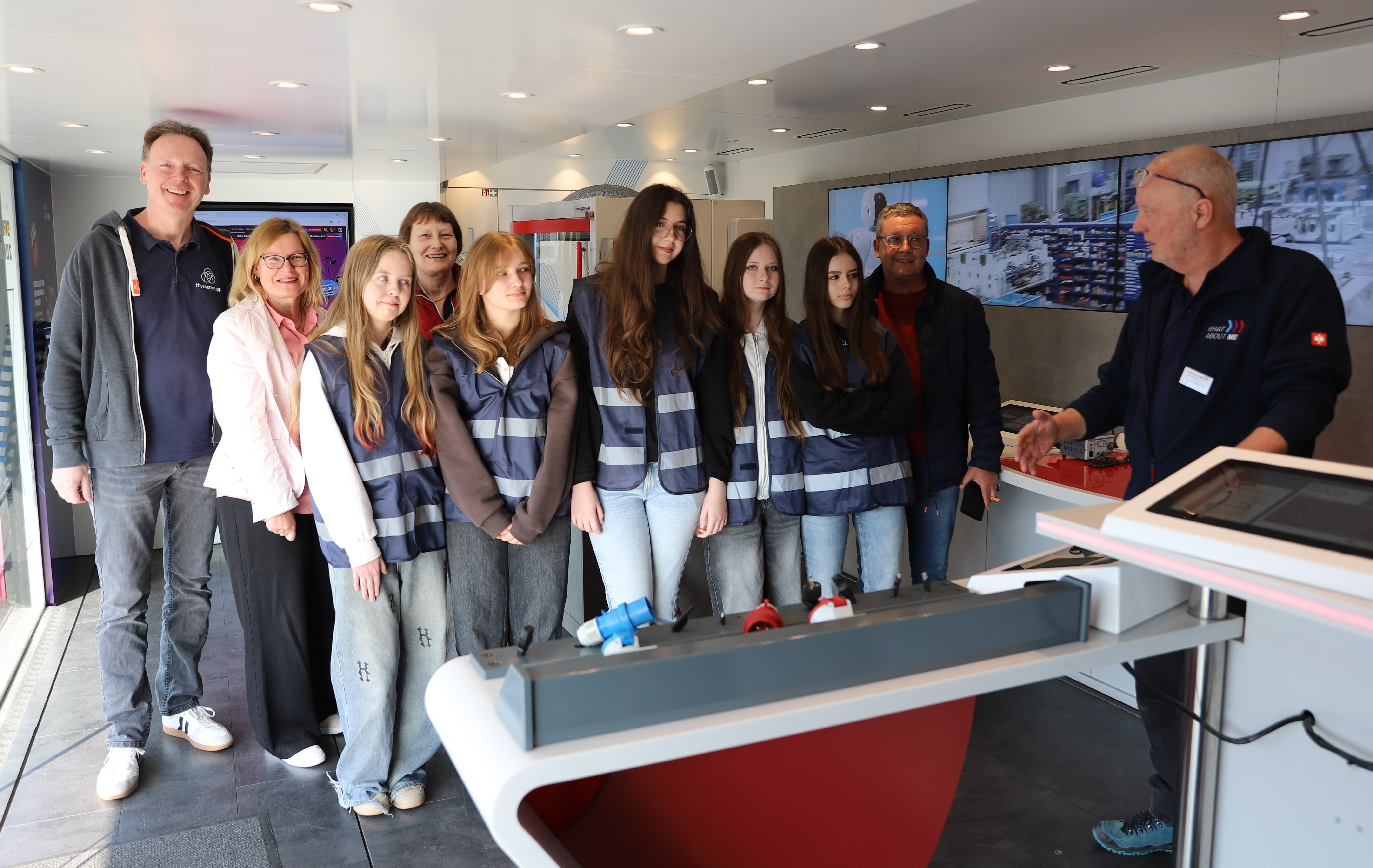 Der InfoTruck ist ein mobiler Erlebnisraum, der Jugendlichen realistische Einblicke in Berufe, Technologien und Abläufe der Metall- und Elektroindustrie ermöglicht. Nun ist er auch außen neu gestaltet und rollte in diesem Design erstmals auf das Betriebsgelände von thyssenkrupp MillServices & Systems. Für die Schülerinnen und Schüler der Gesamtschule Weierheide hieß es „Hands on“: Im Truck konnten sie verschiedene Stationen zu Steuerungstechnik, Automatisierung und Messtechnik ausprobieren.