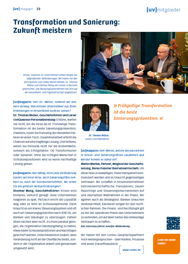 Dr. Thomas Müller, Geschäftsführer und Leiter conQuaesso Personalberatung: Erstens, warten Sie nicht, bis die Krise da ist. Frühzeitige Transformation ist die beste Sanierungsprävention. Zweitens, holen Sie frühzeitig die relevanten Parteien an einen Tisch. Zusammenarbeit erhöht die Chancen auf eine tragfähige Lösung. Und drittens, sehen Sie Personal nicht nur als Kostenfaktor, sondern als Erfolgsfaktor. Ob Transformieren oder Sanieren: Ohne die richtigen Menschen in Schlüsselpositionen wird es keine nachhaltige Lösung geben.
