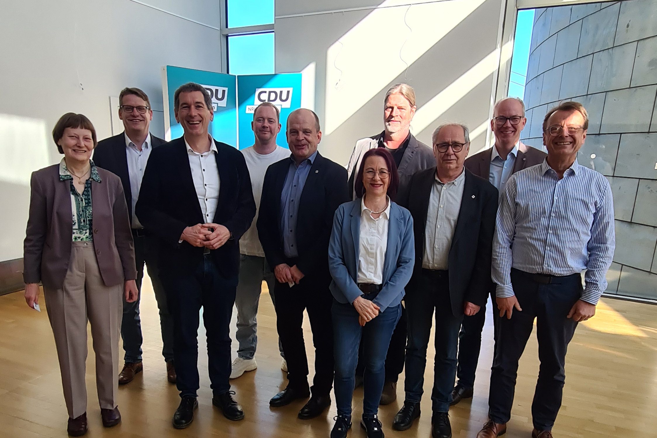 Der Unternehmerverband Soziale Dienste und Bildung machte im März 2026 im Landtag konkrete Vorschläge zur Kita-Refinanzierung. Kita-Betreiber schilderten ihre finanziellen Herausforderungen sehr praxisnah (auf dem Foto von links): Elisabeth Schulte, Jörg Olthues, Jens Kamieth MdL, Justus Behmenburg, Michael Reichelt, Verena Birnbacher, Rolf Wöste, Karl-Heinz Theußen, Daniel Hagemeier MdL und Eberhard Gröh.